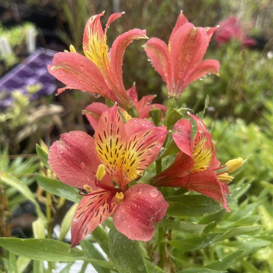 Alstroemeria Appel Bloesem stands out in the garden with its tall stems, lovely coral to rose pink blooms, and geranium coloured red spot on each of the 3 large petals. The inner petals of the flowers are half yellow with dark spots and lines.
