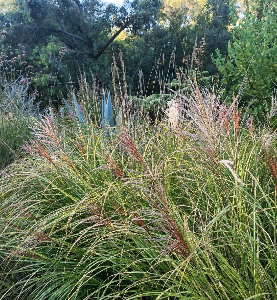 A very handsome and distinctive grass. A kaleidoscope of colours are revealed in the foliage when subjected to Autumn frost conditions. Upright to 1.8m. Drought tolerant and stunning.
