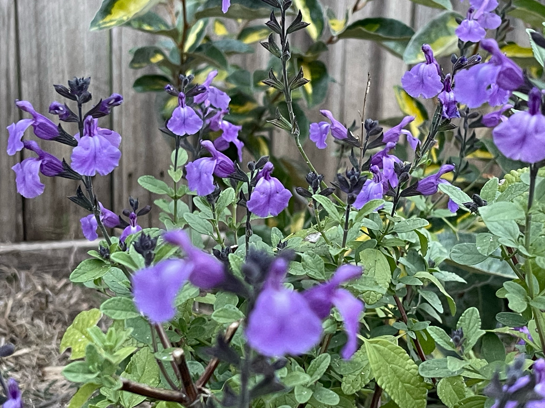 ‘Mesa Azure’, a very old cultivar which is sometimes sold especially in Queensland as Mrs Bucket. carries clouds of soft mauve flowers over a compact bush during the whole year. Happy in any sunny well drained spot and can take some dryness during summer. 50cm tall by 60cm across.