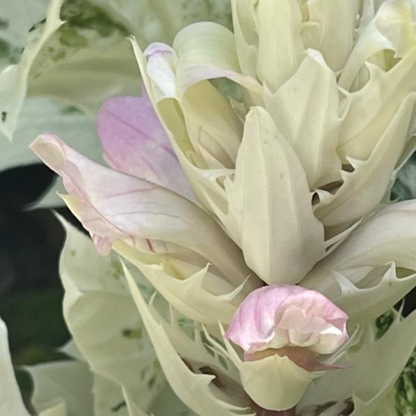 Whitewater is a fantastic variegated form of Acanthus mollis also commonly called Bear’s Breeches. It is tough and hardy. A little slower growing than the green form. It lights up the garden with its beautiful variegated foliage. Dark green deeply cut leaves, splashed and edged with creamy white margins, it is a bold architectural perennial. In summer it produces flower stems that rocket up above the foliage. Creamy white and blushing pink.Â